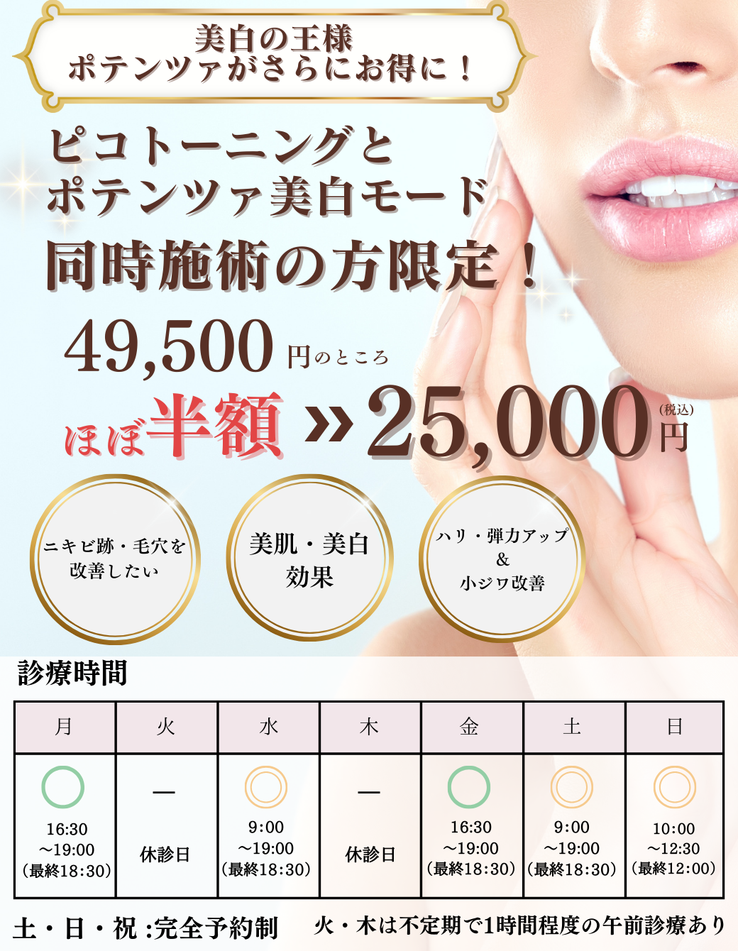 - 合計 25,000円(税込)でポテンツァ(全顔)+ピコトーニング(全顔)が受けられます