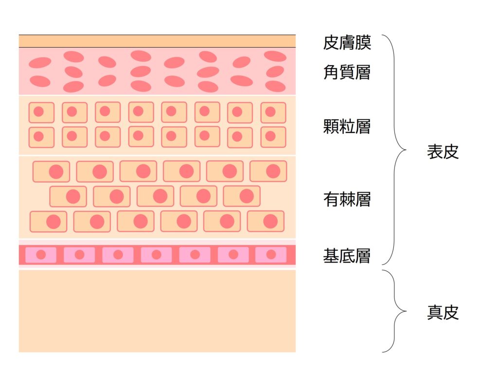 最初に全体像からお伝えしますと、それぞれの施術は、肌のどの層にアプローチするかが変わります。人の肌は、そもそも表皮・真皮・皮下組織の3層構造に分かれており、また、表皮の中でも角質層・顆粒層・有棘層・基底層に分かれます。