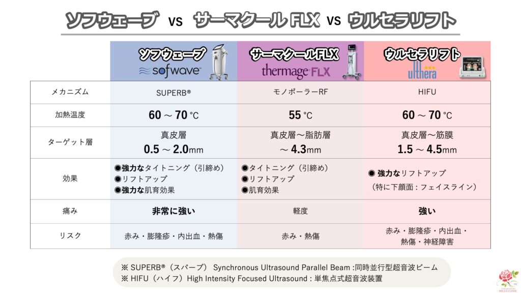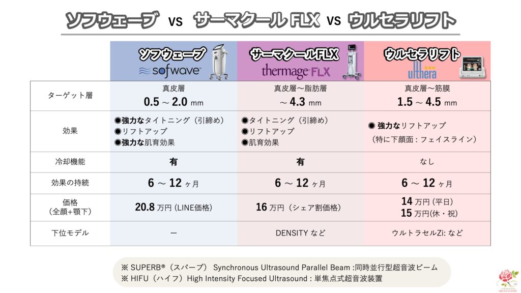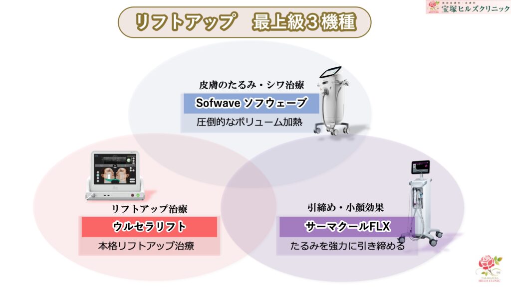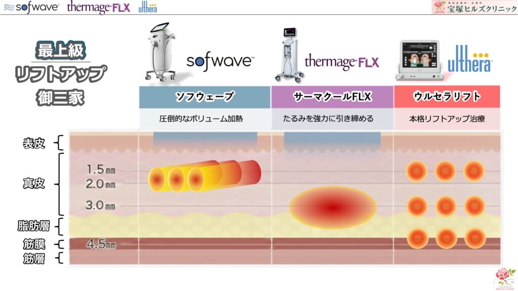 今回は、定番たるみ治療のウルセラリフトから、サーマクールFLX・SOFWAVEまで、いわゆる